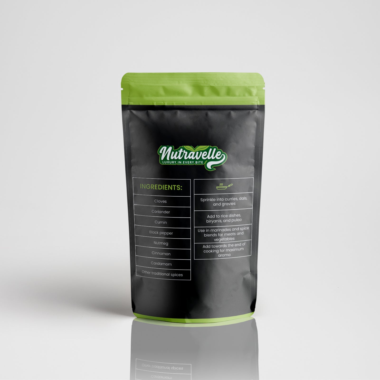 Nutravelle Garam Masala is a premium spice blend with a warm, aromatic, and slightly sweet flavor. Perfect for enhancing curries, dals, and rice dishes, it adds depth, richness, and authentic taste to everyday cooking.
